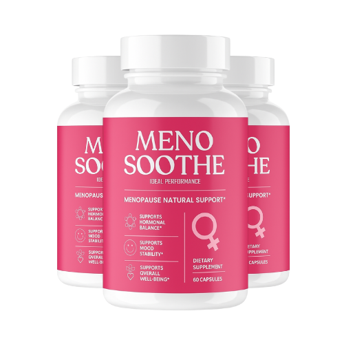 MenoSoothe is a natural supplement formulated to ease symptoms of menopause by supporting hormonal balance, calming fluctuations in estrogen and progesterone, and managing cortisol levels.
